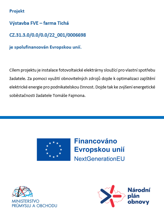 Projekt Výstavba FVE - farma Tichá CZ.31.3.0/0.0/0.0/22_001/0006698 je spolufinancován Evropskou unií.