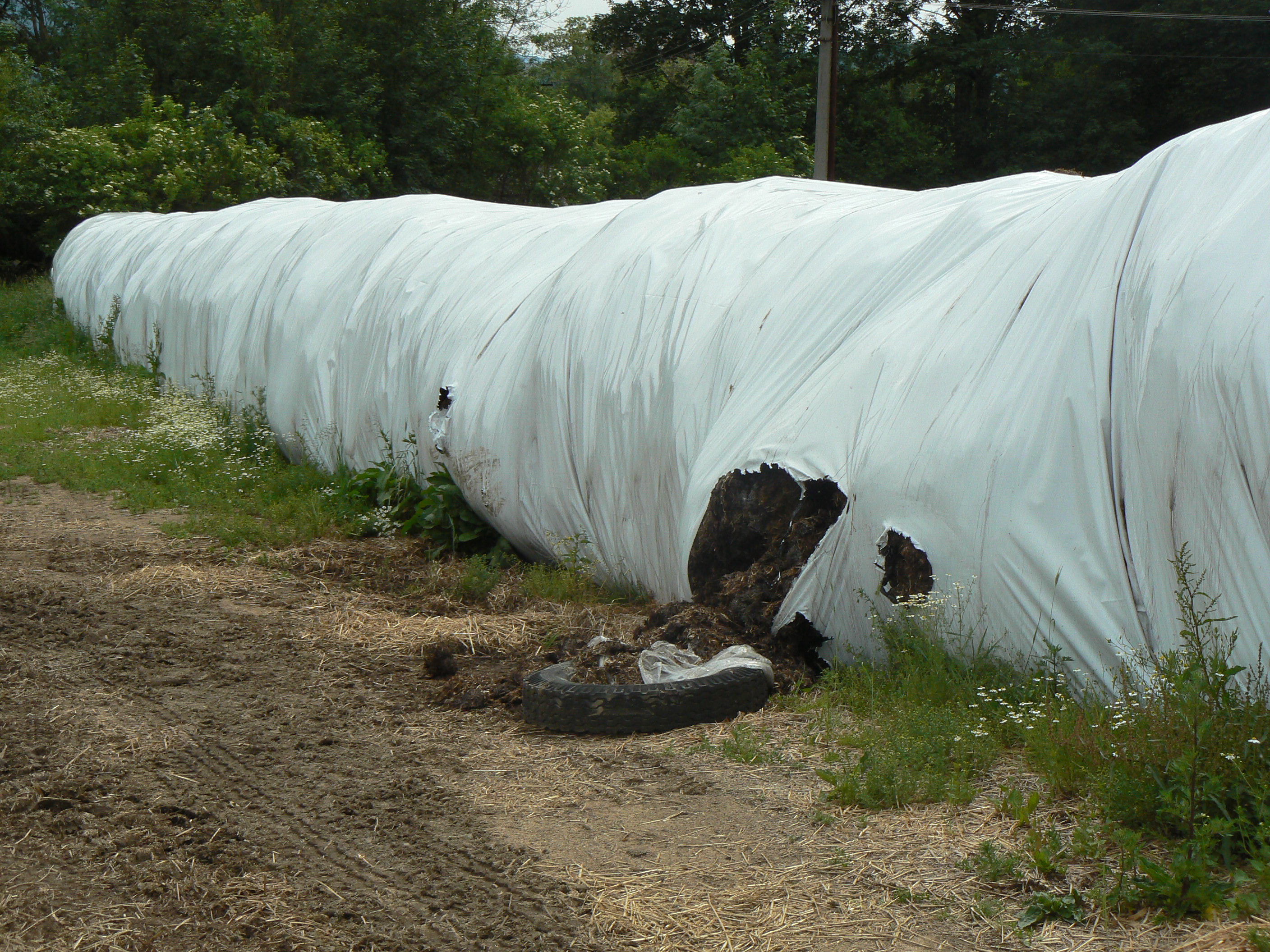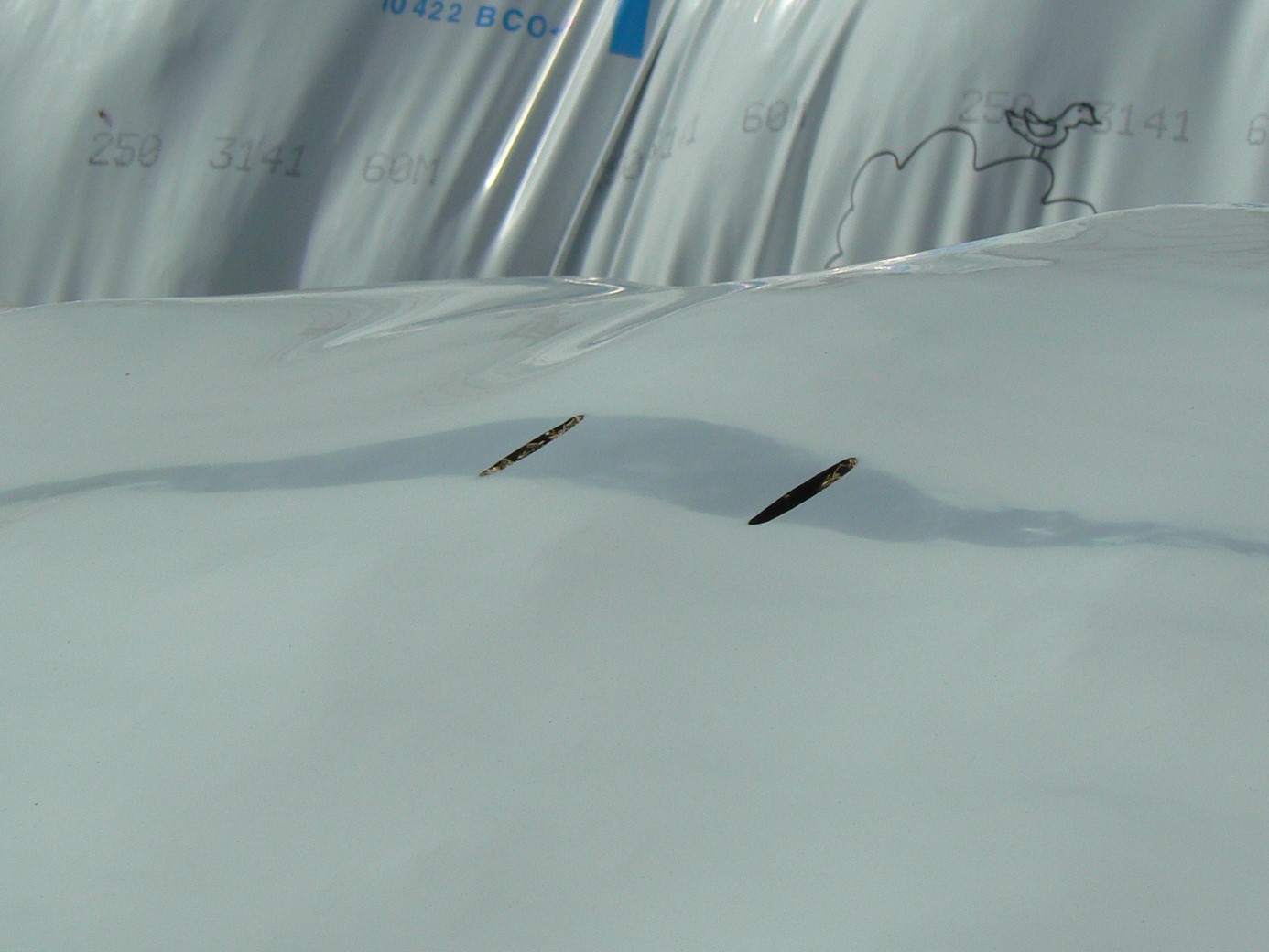 Takto vypadá poškození folie vaku od zvířat: kočky, kuny, lišky a ptáci. Dírky jsou obvykle v horní části, kde nejsou dobře vidět, a pak působí zkažení horní vrstvy krmiva. Pokud jsou na vaku vzduchové kapsy, tak se může kyslík ze vzduchu dostat ještě dál.